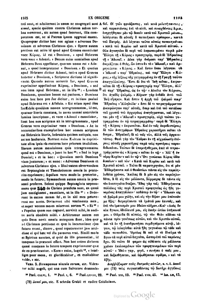 • ギリシャ語原文(右列)Ἔστι δέ τι τετραγράμματον ἀνεκφώνητον παρ’ αὐτοῖς, ὅπερ καὶ ἐπὶ τοῦ πετάλου τοῦ χρυσοῦ τοῦ ἀρχιερέως ἀναγέγραπται, καὶ λέγεται μὲν τῇ « Ἀδωναὶ » προσηγορίᾳ, οὐχὶ τούτου γεγραμμένου ἐν τῷ τετραγράμματῳ· παρὰ δὲ Ἕλλησι τῇ « Κύριος » ἐκφωνεῖται.